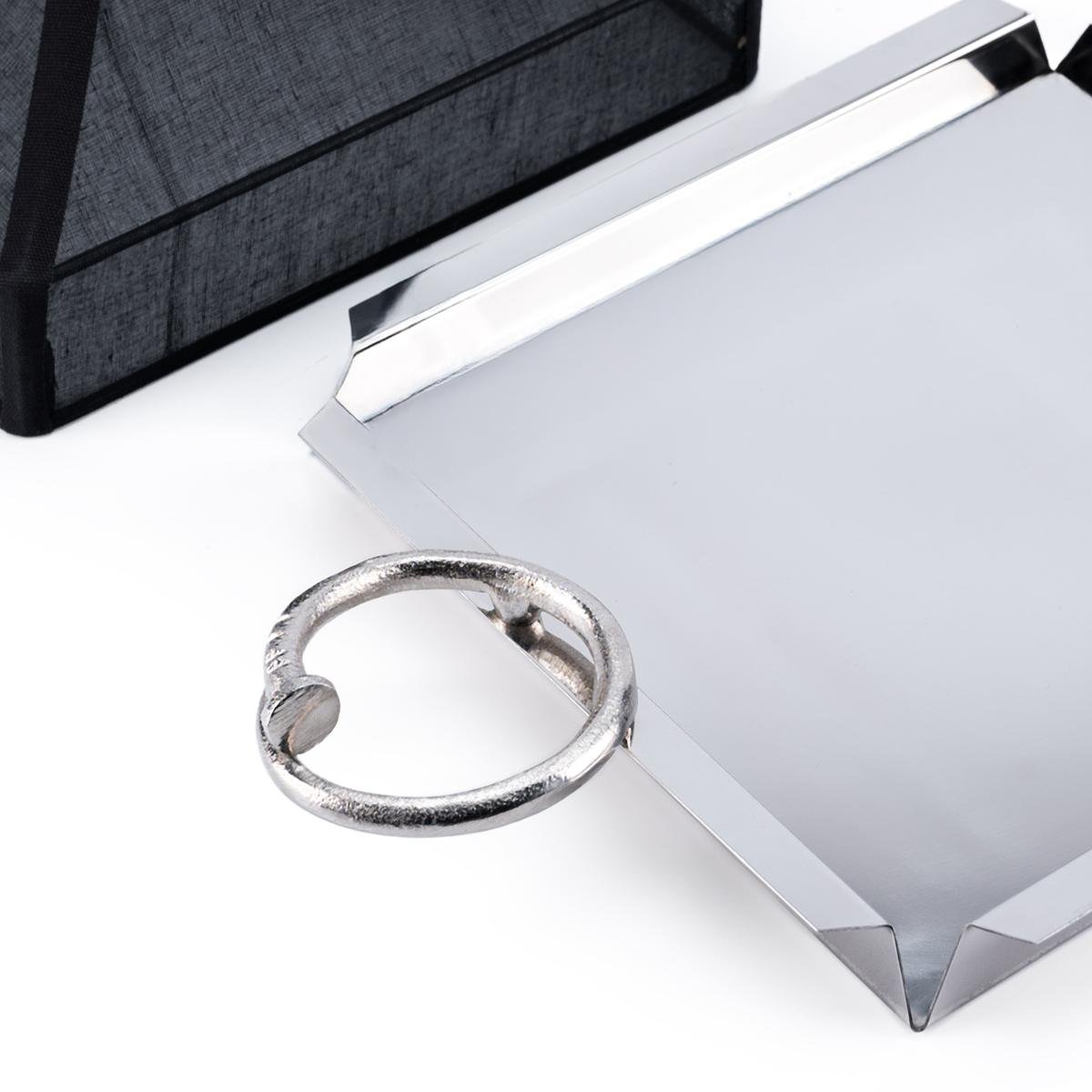 تتميز بمقبض مسمار أنيق على طراز كارتييه. مصنوعة بدقة، هذه الصينية مثالية لتقديم الحلويات والمأكولات الشهية الأخرى بأسلوب راقٍ. تأتي الصينية مع غطاء قماش قطني أنيق، لضمان بقاء الحلويات طازجة ومحفوظة.