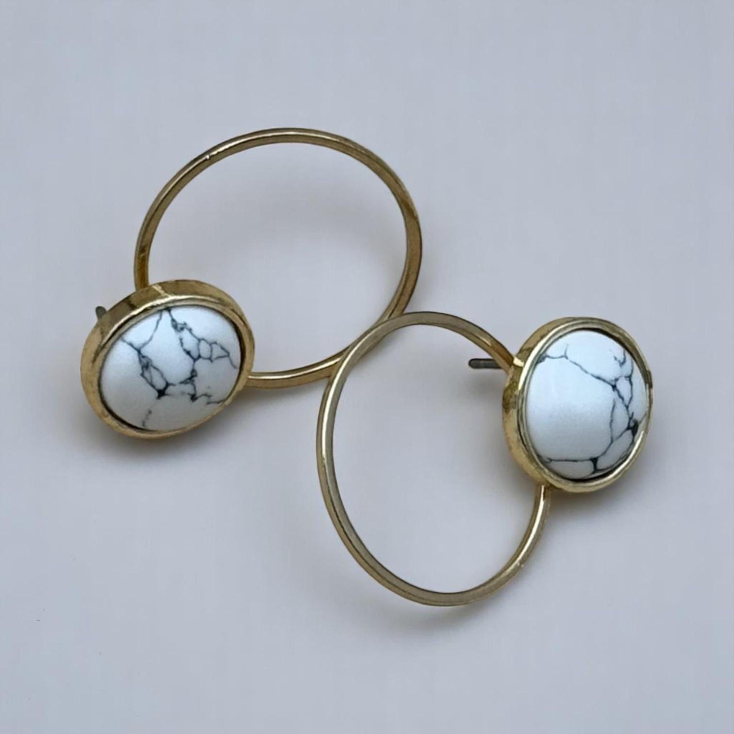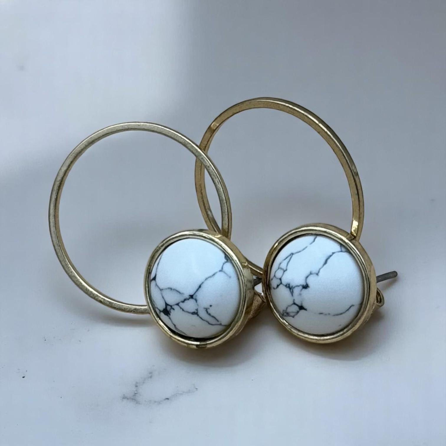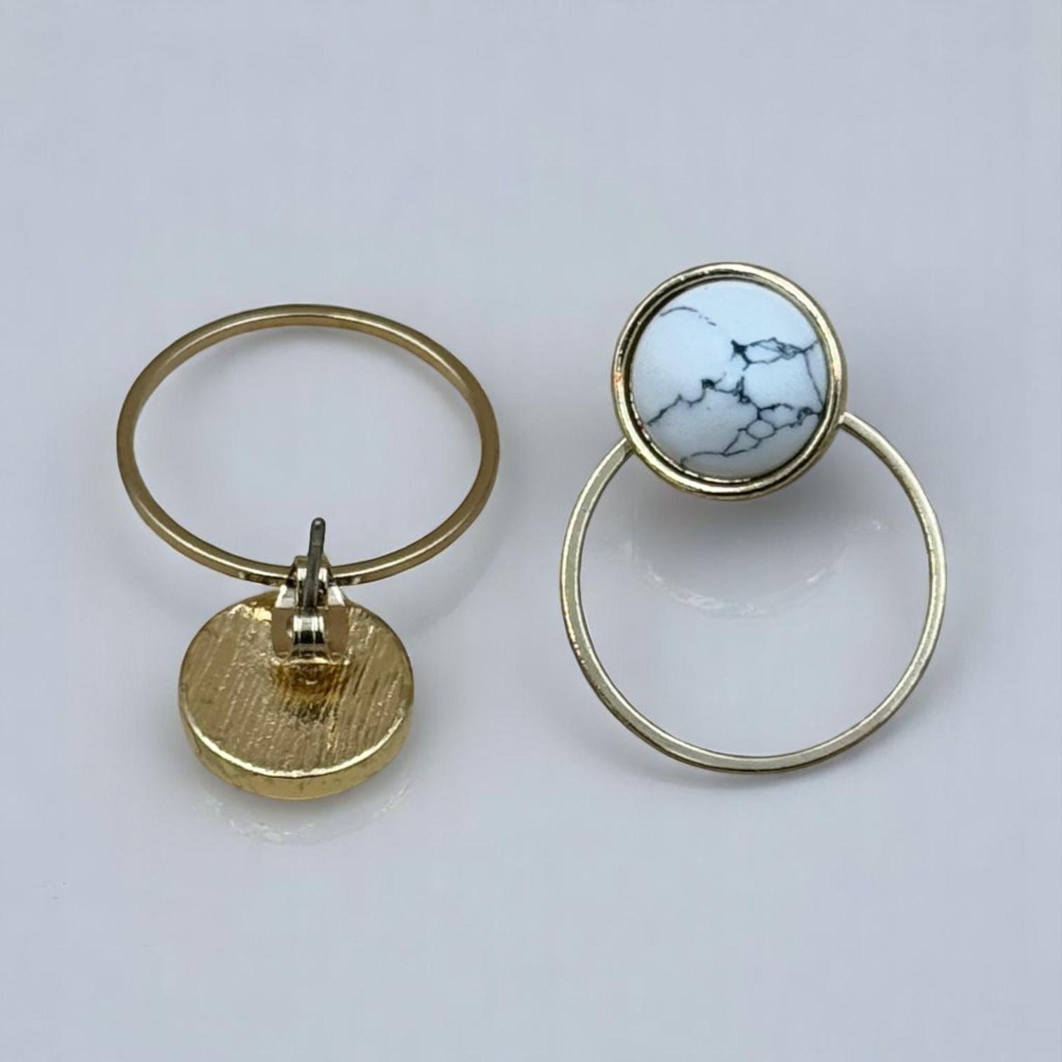 حجر رخامي ناعم يتدلّى داخل إطار دائري بلون ذهبي، مما يمنح الأقراط تأثيرًا عائمًا مميزًا يخطف الأنظار. مثالية لإضافة لمسة راقية على إطلالتك سواء كانت نهارية أو مسائية.