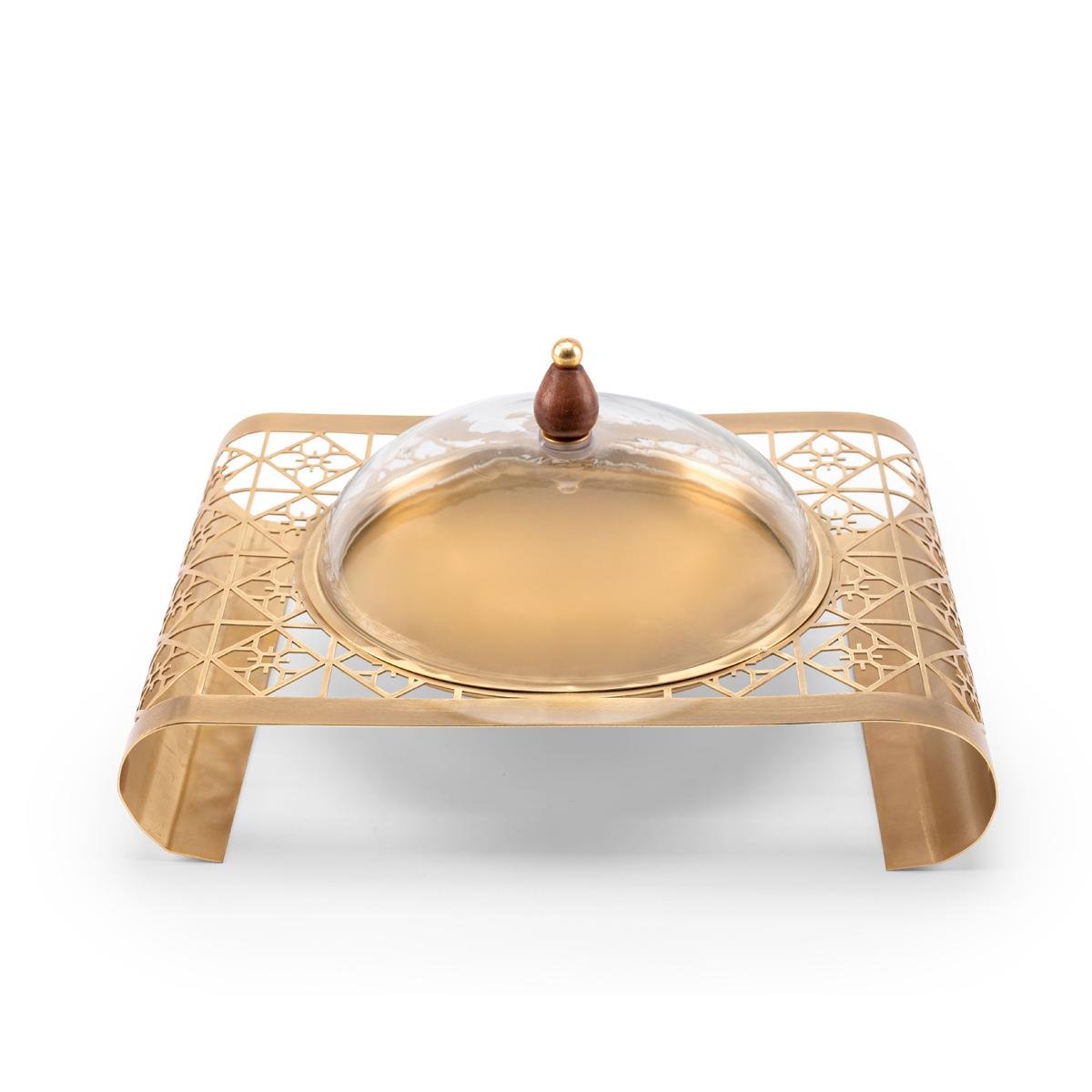 طبق تقديم للحلويات بتصميم ليزر حديث وغطاء زجاجي. يتميز هذا الطبق الأنيق بتصميم فاخر يجمع بين الجمال والوظيفية، مما يجعله مناسبًا لتقديم الحلويات، التمر، أو المكسرات بأسلوب جذاب. يمنحك الإطار المعدني المذهب بتصميمه الدقيق لمسة فريدة من الفخامة، بينما يحافظ الغطاء الزجاجي الشفاف على نضارة المأكولات وحمايتها. ويضفي المقبض الخشبي المطعم بالذهب لمسة نهائية أنيقة تناسب جميع الأذواق.