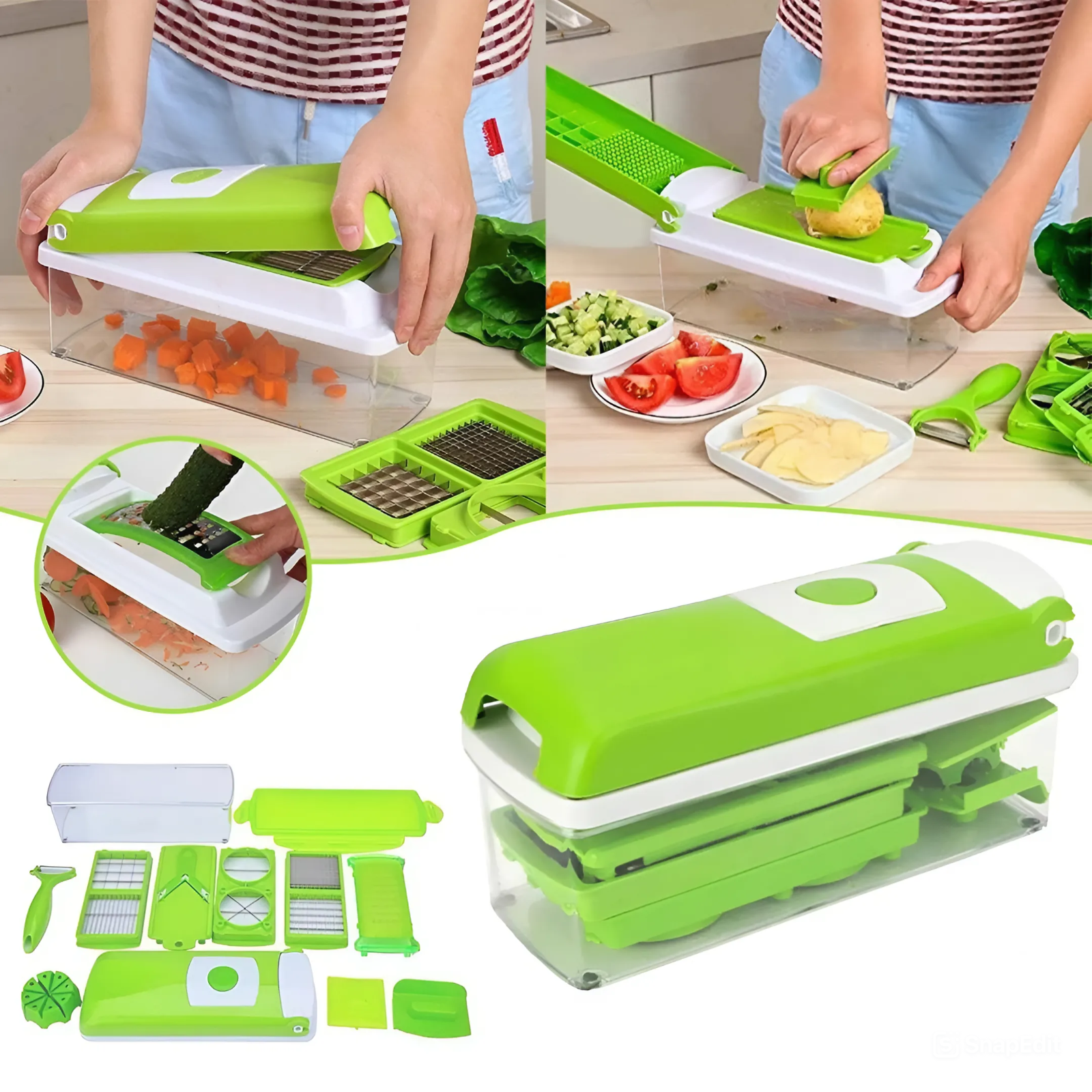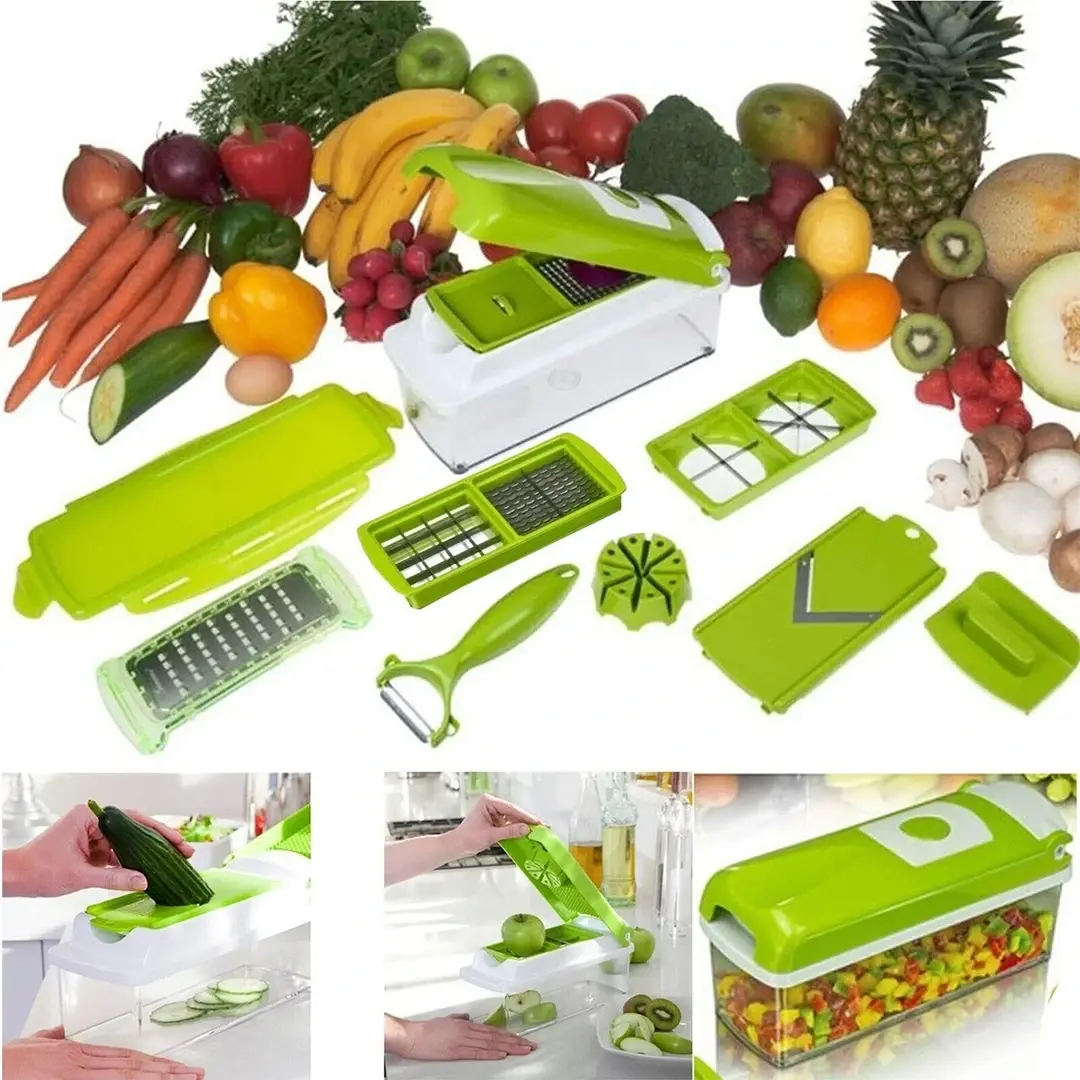 قطاعة الخضار والفواكه الذكية متعددة الوظائف 12 في 1 - تتضمن: 3 × شفرات تقطيع (ناعمة ومتوسطة وكبيرة)، 2 × قطاعة (مستقيمة ومموجة)، 1 × مبشرة، 1 × قطاعة جوليان، 1 × قطاعة حلزونية، 1 × مقشرة، 1 × فاصل بيض، 1 × حامل طعام آمن.