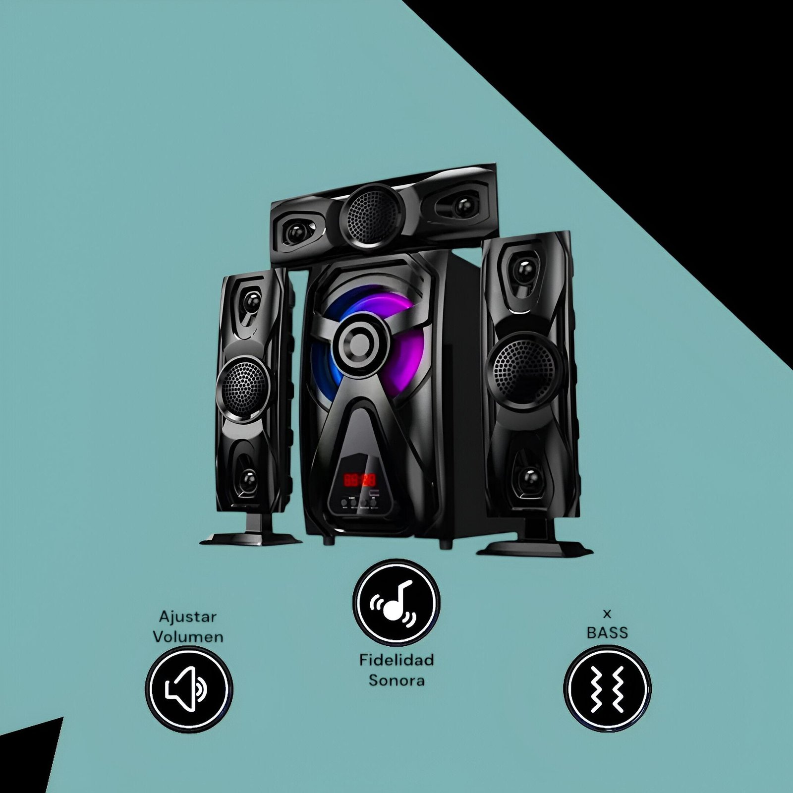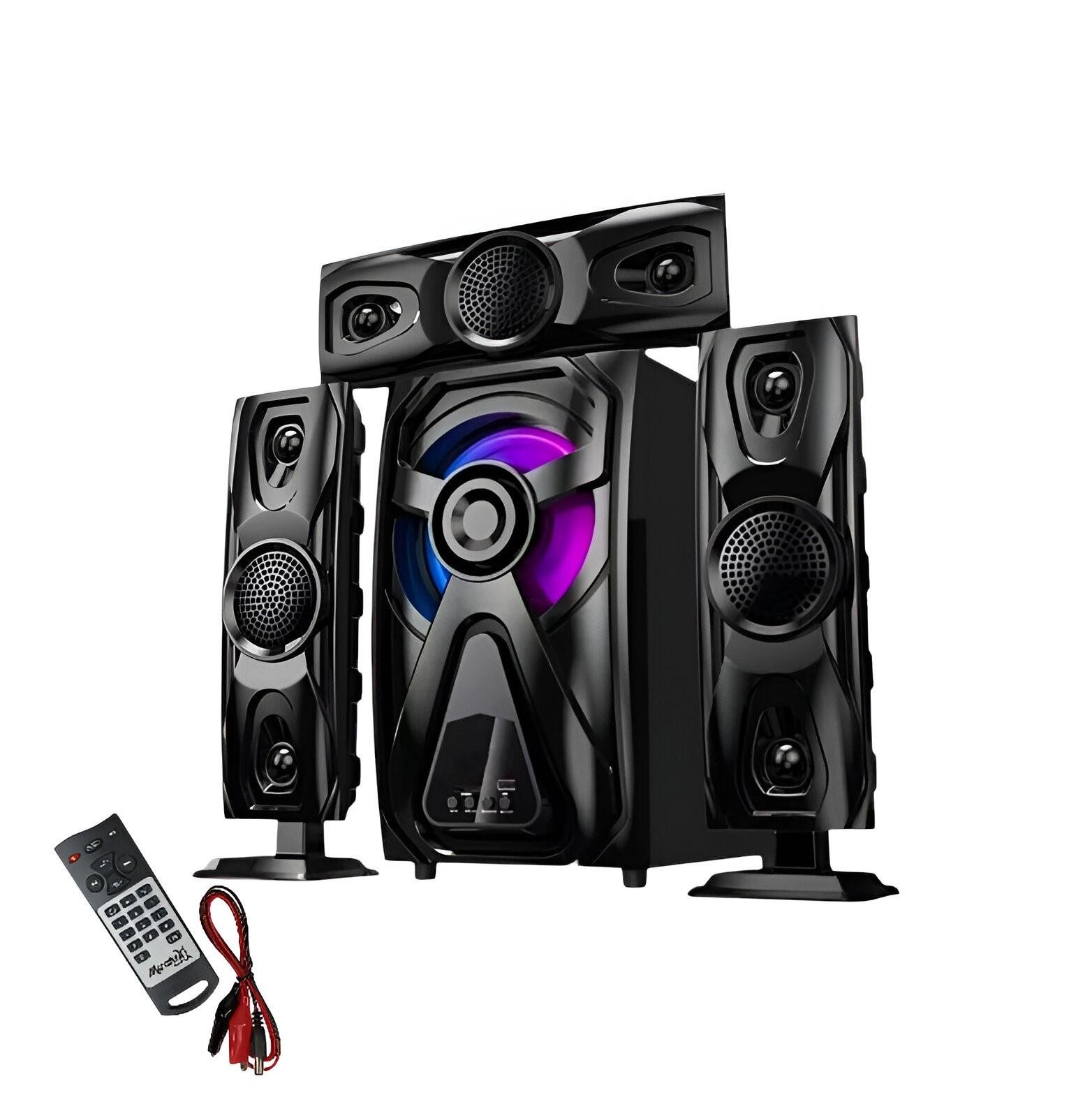 | الخصائص | نظام صوتي 3.1 قناة، مضخم صوت بقدرة 40 واط (6.5 إنش)، و3 سماعات محيطية بقدرة 10 واط (3 إنش) لكل منها. الاستجابة الترددية: * مضخم الصوت: 28 هرتز – 200 هرتز * السماعات: 38 هرتز – 20 كيلوهرتز نسبة الإشارة إلى الضوضاء: >75 ديسيبل الطاقة الكهربائية: 220–240 فولت، 50/60 هرتز يدعم: USB / SD / بلوتوث / راديو FM / شاشة LED / جهاز تحكم عن بُعد أبعاد مضخم الصوت: 200×340×355 مم أبعاد السماعات: 107×345×70 مم