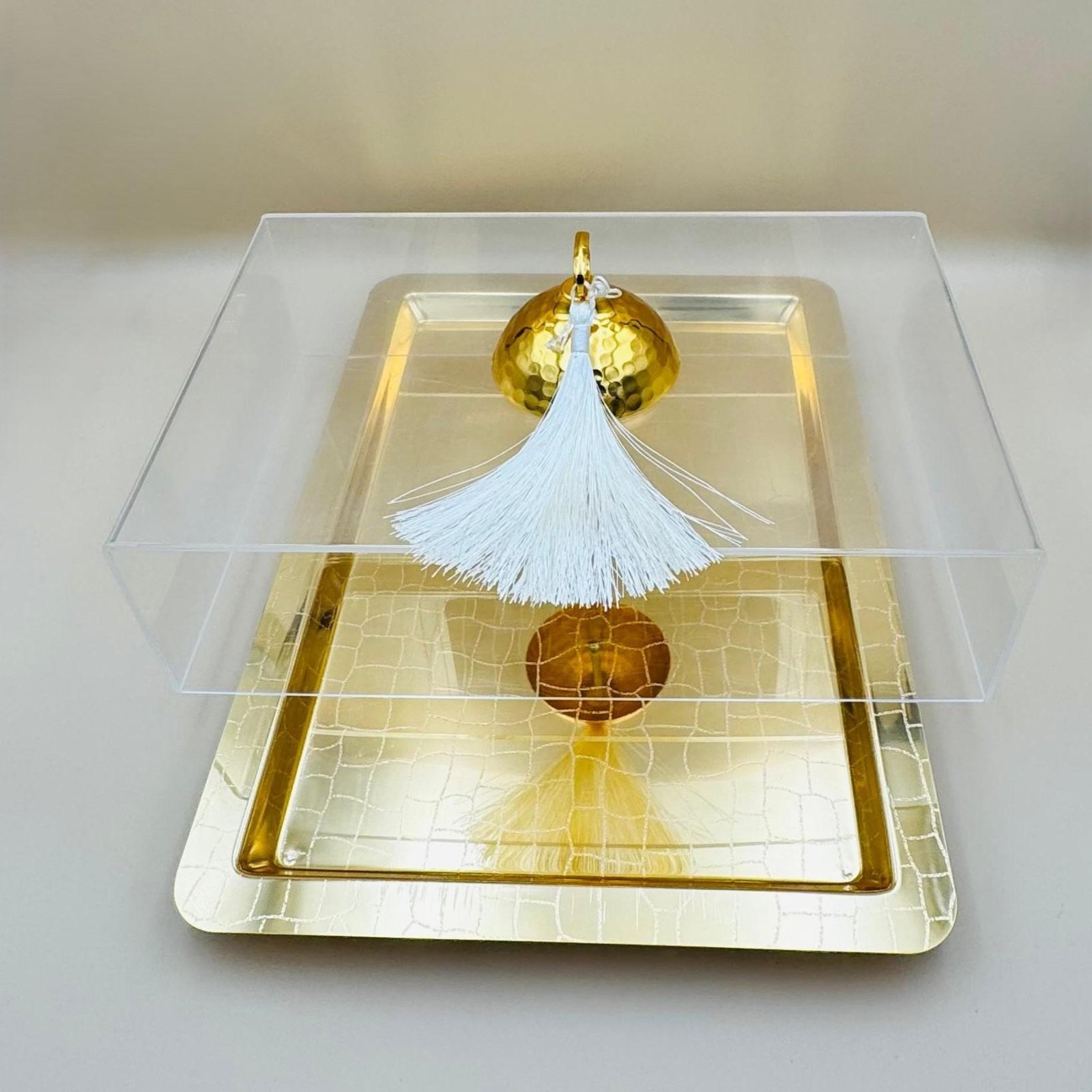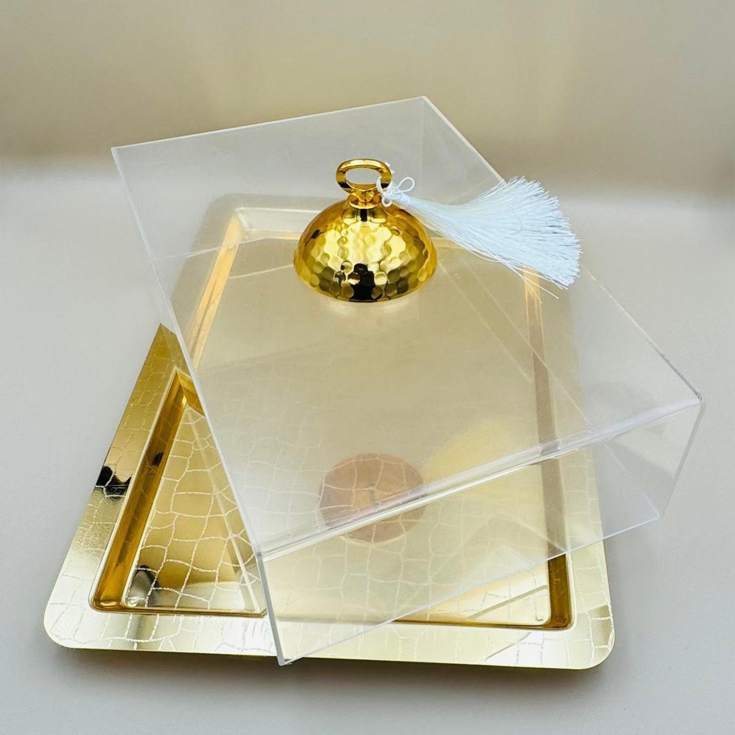 أضيفي لمسة من الفخامة إلى مائدتك مع هذا الصحن الذهبي الأنيق مع صحن حلويات مستطيل من الأكريليك الذهبي