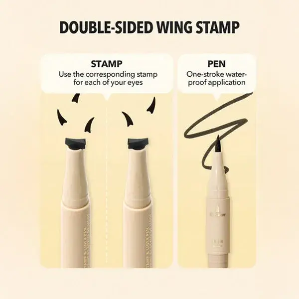 يتميز هذا الآيلاينر بتصميم مزدوج يجمع بين قلم تحديد دقيق لرسم خطوط سلسة ومحددة، وختم جناح مبتكر يضمن لكِ أجنحة متماثلة بسهولة تامة. تركيبته عالية التصبغ، مضادة للتلطخ والماء، تمنحك لونًا أسود غنيًا يدوم طوال اليوم دون بهتان. سواء كنتِ ترغبين في آيلاينر ناعم أو مظهر درامي جذاب، هذا القلم يجعل الأمر بسيطًا وسريعًا.