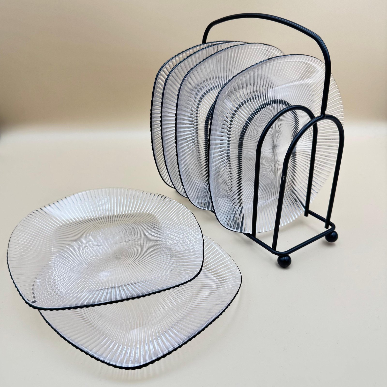 امنحي سفرتك لمسة عصرية مع هذا الطقم الأنيق والمميز مع طقم أطباق زجاجية مربعة مكون من 6 قطع بنقشة مموجة وحامل معدني أسود