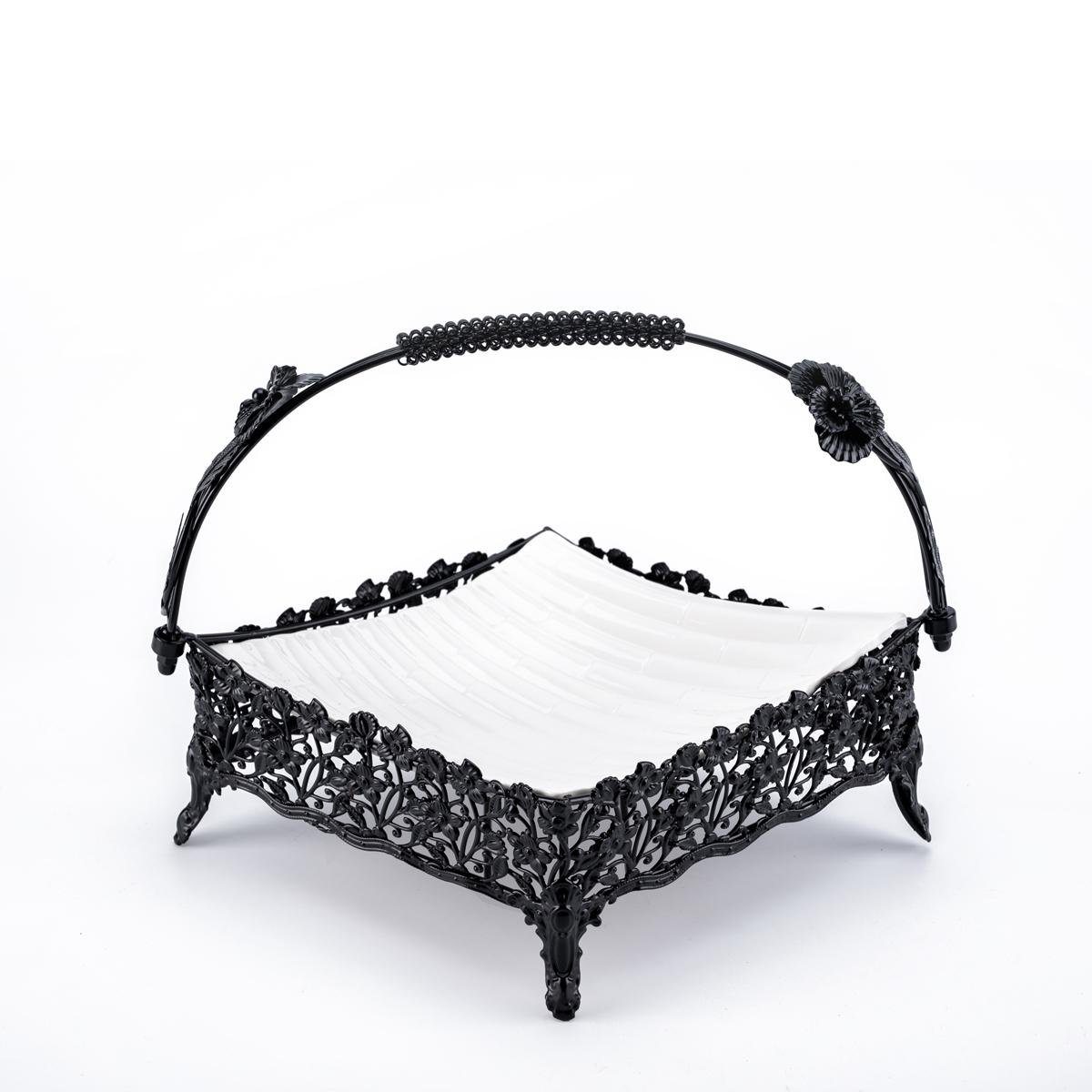 يتميز هذا التصميم العصري بجودة البورسلين الفاخر الذي يوفر سطحًا أملسًا ولامعًا مثاليًا لتقديم المقبلات، الحلويات، أو الوجبات الخفيفة. توفر القاعدة الحديدية السوداء ثباتًا قويًا ولمسة عصرية، بينما يضمن المقبض سهولة الحمل والتقديم. سواء للاستخدام اليومي أو للمناسبات الخاصة