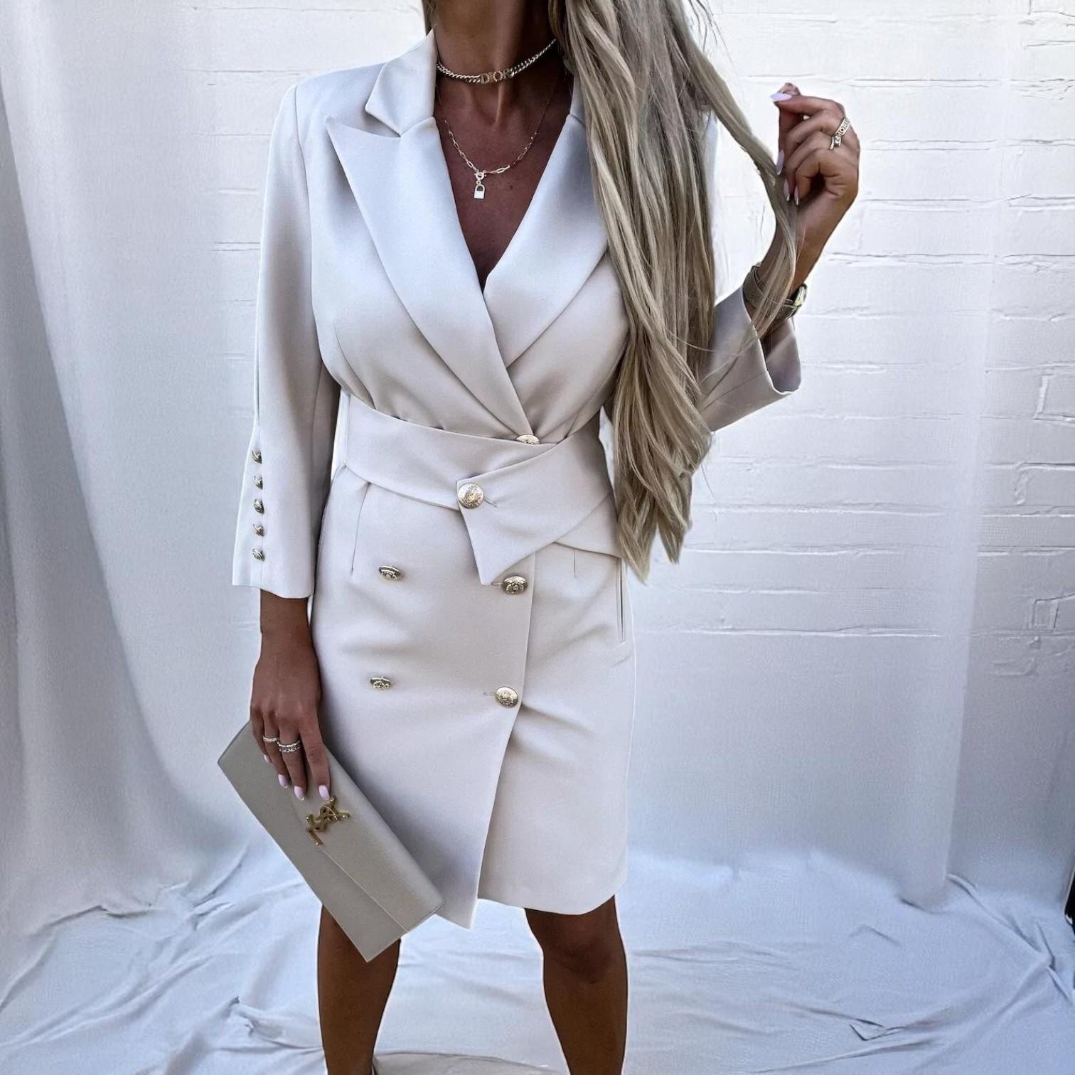 بليزر بتصميم فستان أنيق ورائع. يتميز هذا التصميم بقصة جذابة مع حزام على الخصر، مزين بأزرار ذهبية فاخرة تضيف لمسة من الرقي. مثالي لاجتماعات العمل، والمناسبات الرسمية.