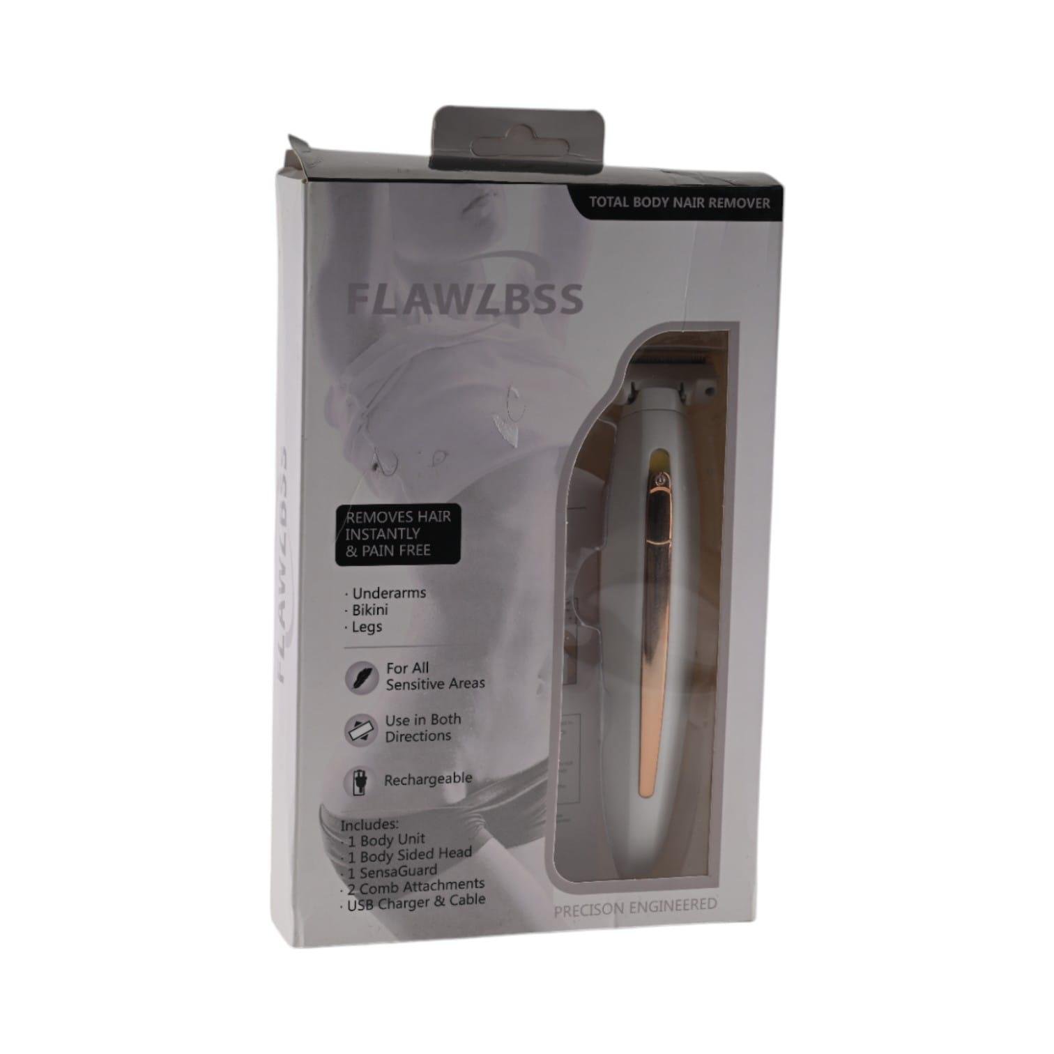 توفر آلة إزالة الشعر Flawzbss إزالة شعر فورية وغير مؤلمة لمنطقة تحت الإبط ومنطقة البيكيني والساقين. مصممة للمناطق الحساسة، وتعمل في كلا الاتجاهين وقابلة لإعادة الشحن. تشتمل على وحدة الجسم، ورأس مزدوج، وSensaGuard، ومشطين ملحقين، وشاحن USB مع كابل.