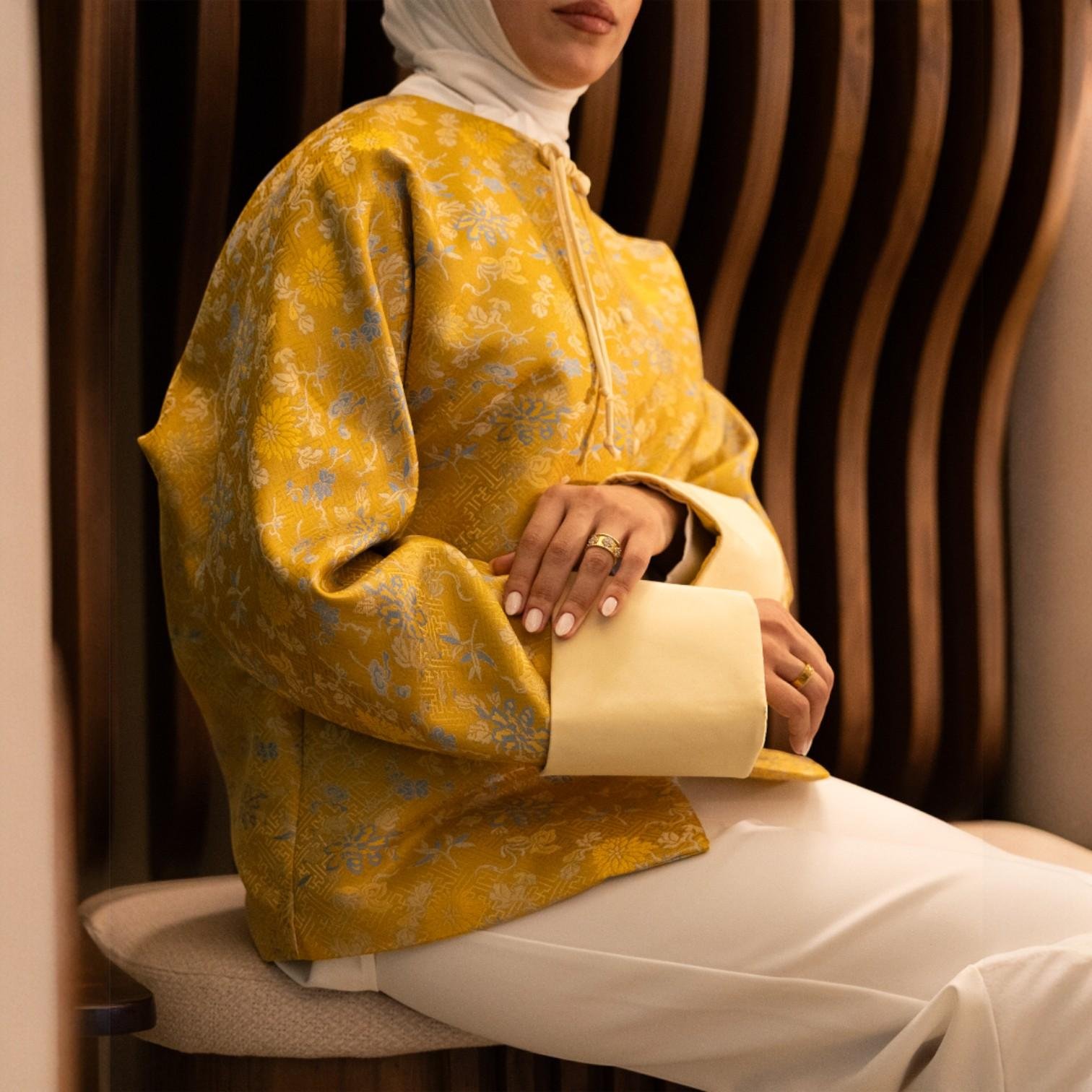مصممة بتفاصيل زهرية أنيقة وخياطة تمنح الجسم شكلا جذابا، هذه السترة تضيف لمسة فاخرة لأي إطلالة، سواء كانت لمناسبة خاصة أو للارتداء اليومي كقطعة مميزة. أناقة فريدة بطابع تقليدي – سترة نسائية مطرزة بياقة ماندارين من قماش البروكار تجمع بين الكلاسيكية واللمسة العصرية