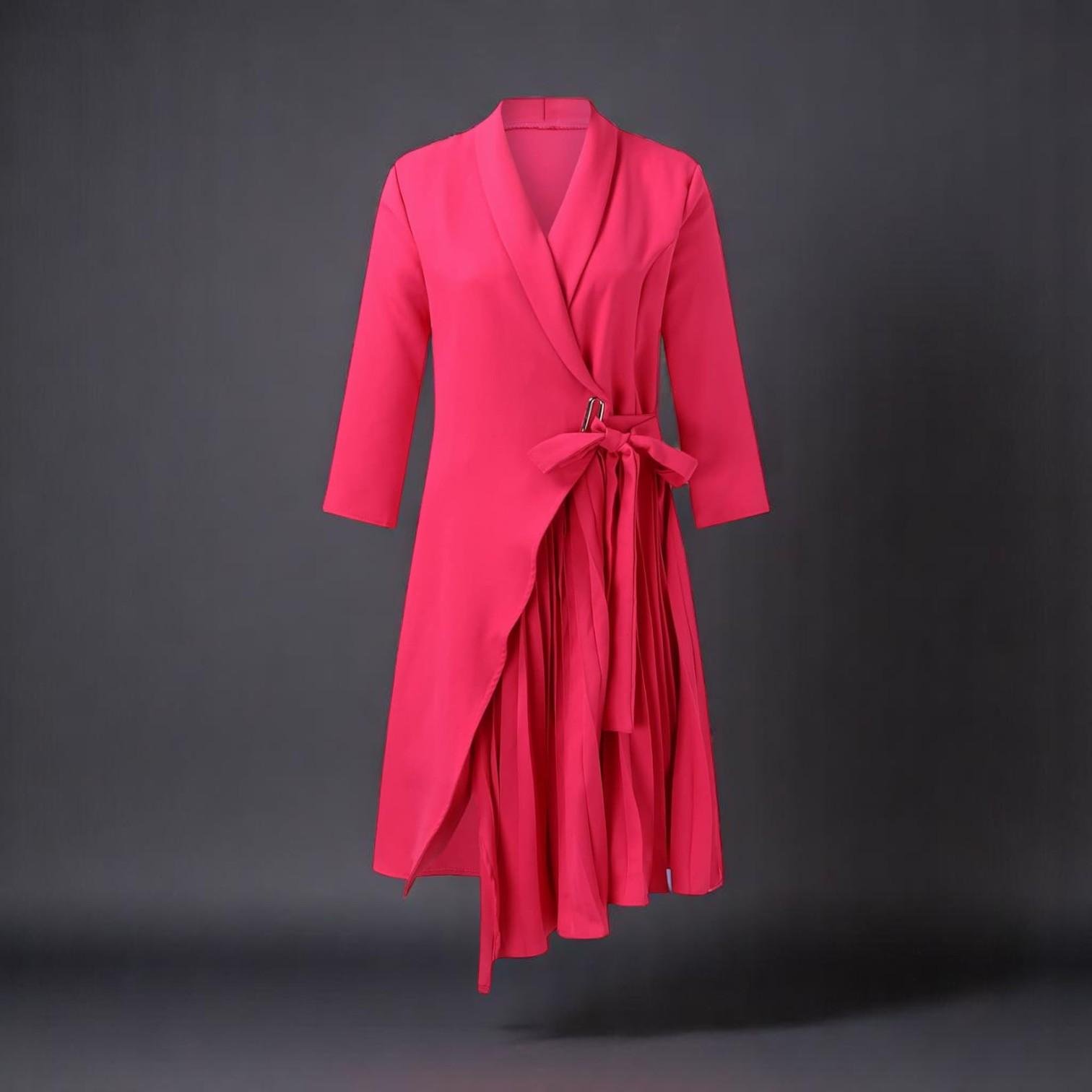 فستان لف أنيق يجمع بين الجمال العصري واللمسات الفاخرة. مع تفاصيل الكسرات التي تضيف لمسة من النعومة، وياقة الشال التي تمنحه لمسة راقية، هذا الفستان هو الخيار المثالي للمناسبات الرسمية أو الخروجات المسائية.