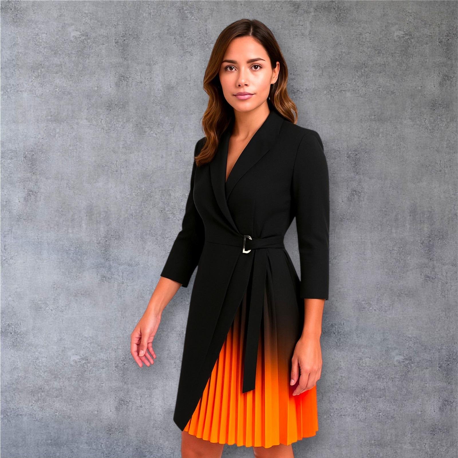 يتميز هذا الفستان بتنورته المتصلة ذات الكسرات باللون البرتقالي الزاهي. الجزء العلوي بتصميم لف أنثوي يبرز جمال القوام، والتنورة البرتقالية تضيف لمسة من الحيوية والحركة العصرية.